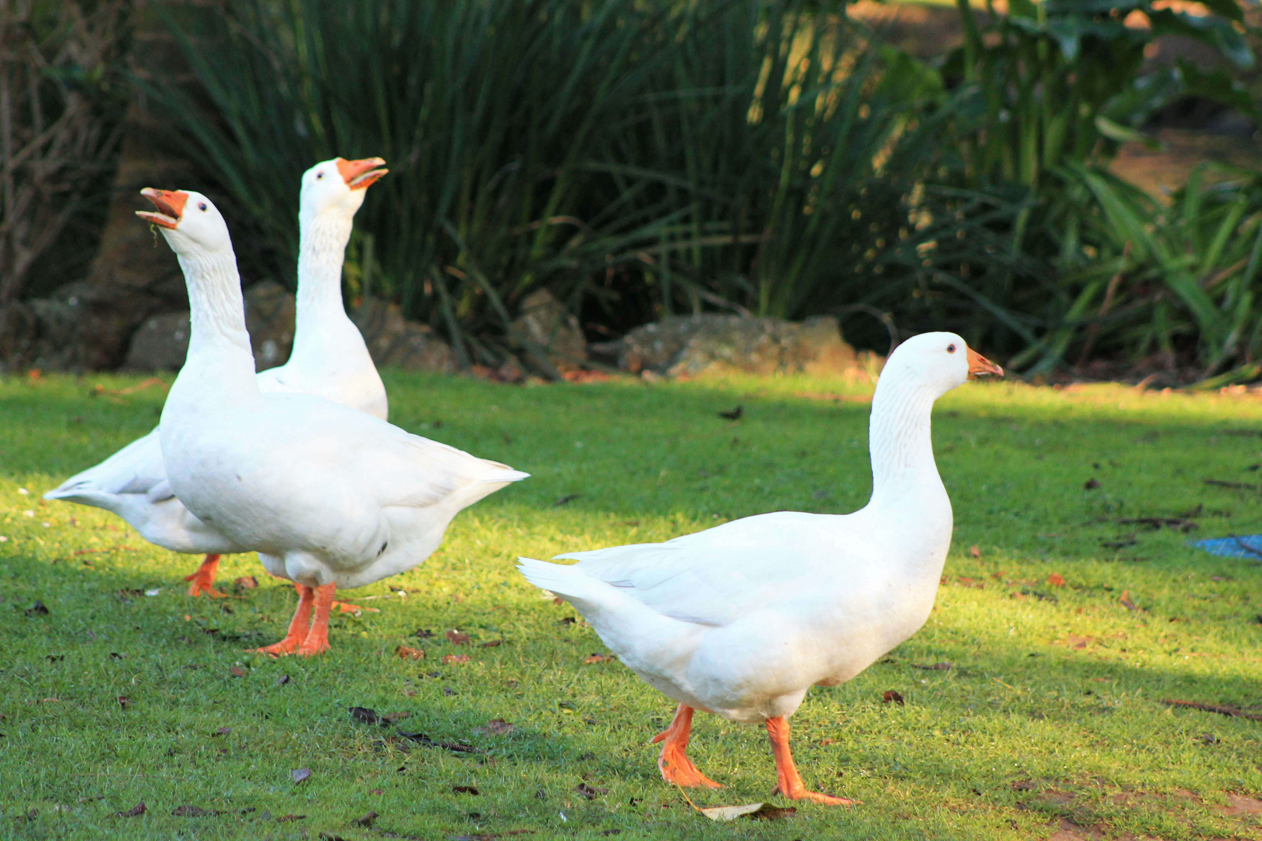 Provide fresh grass, grains, and clean water daily to keep geese healthy.